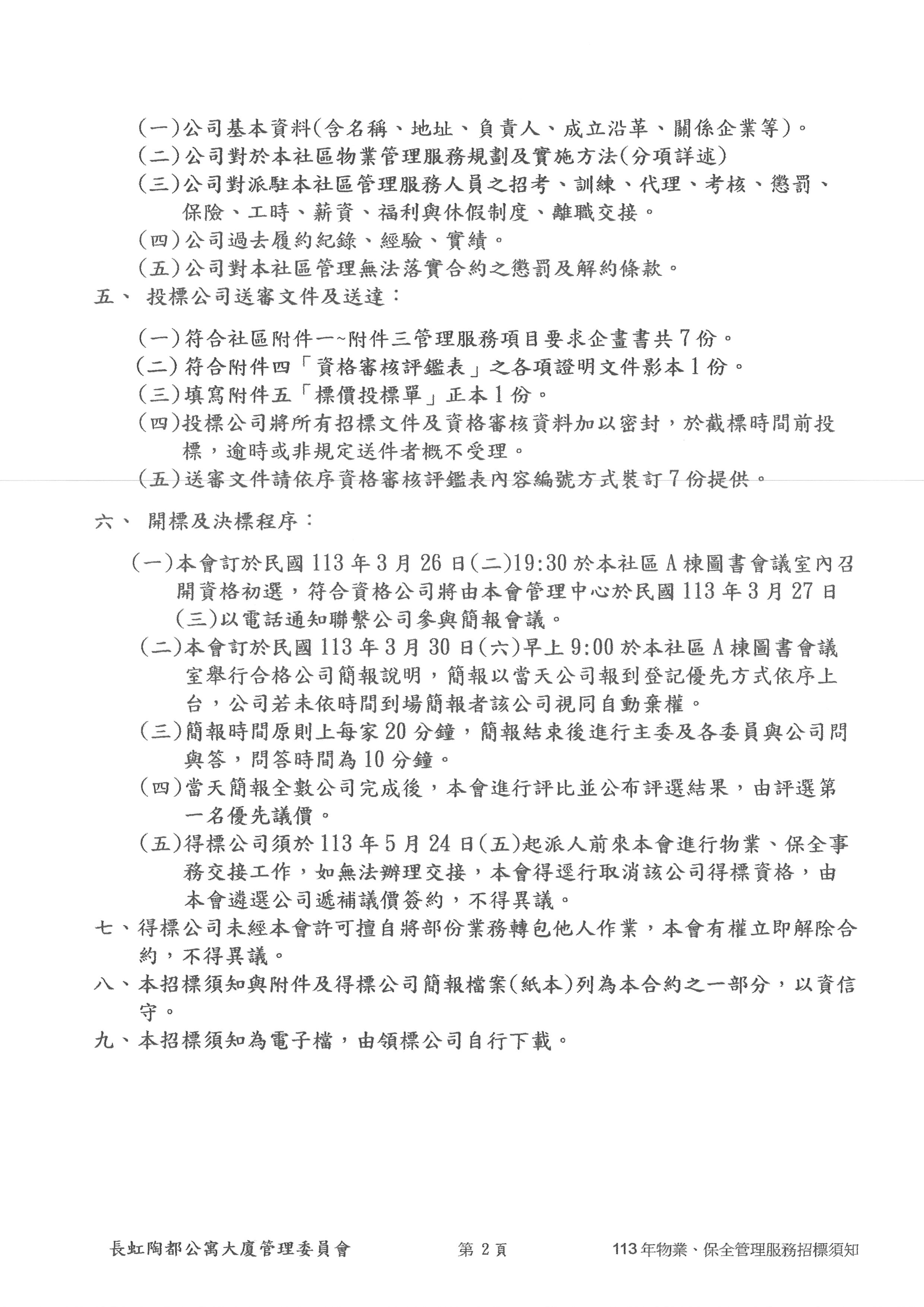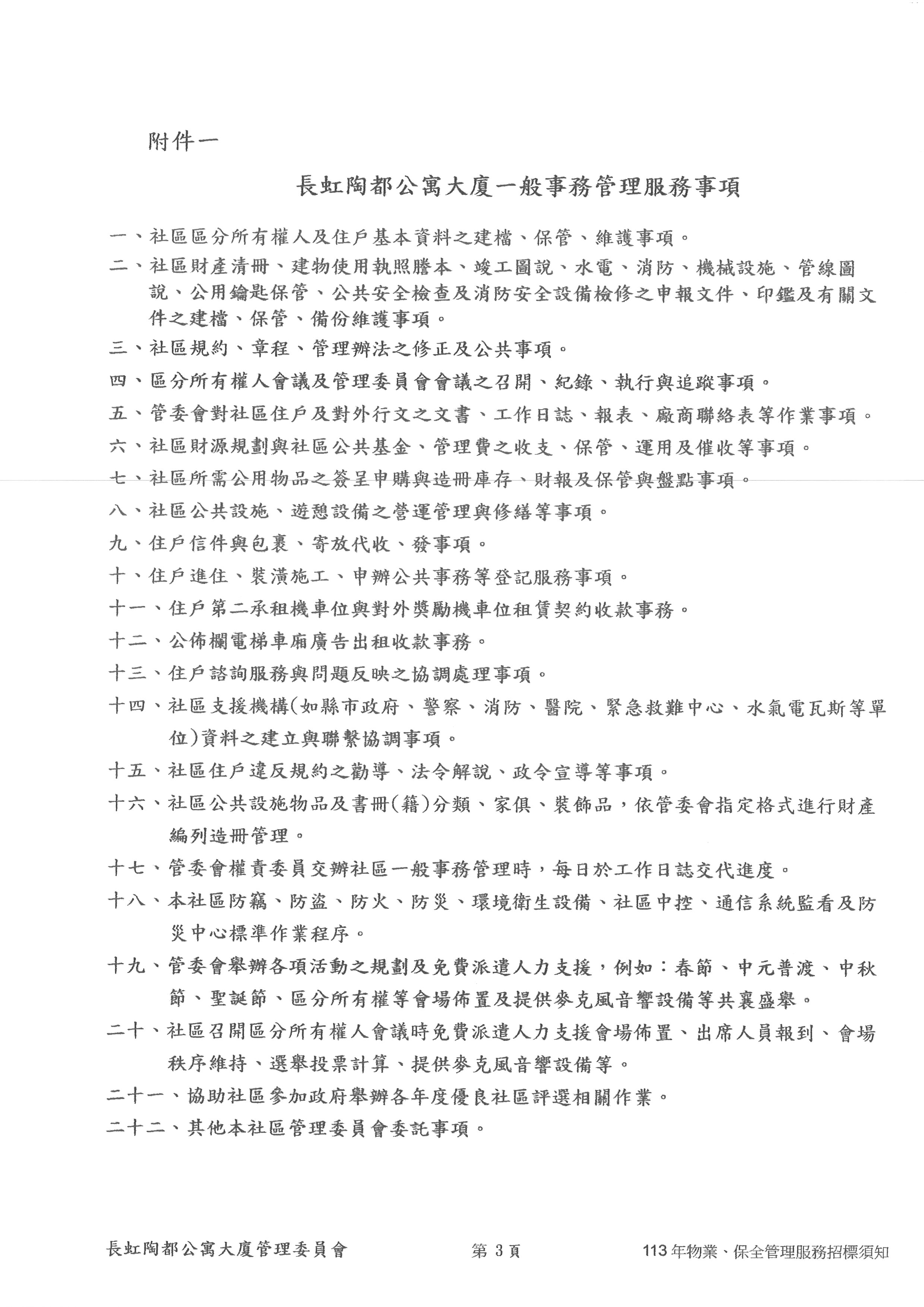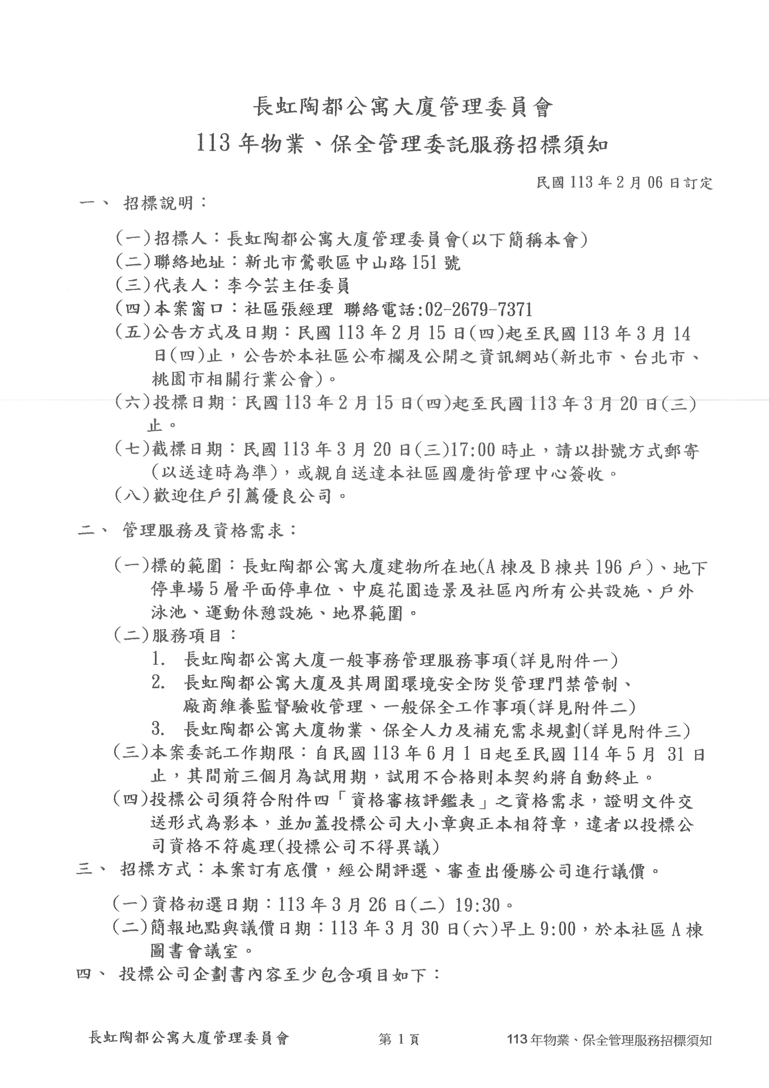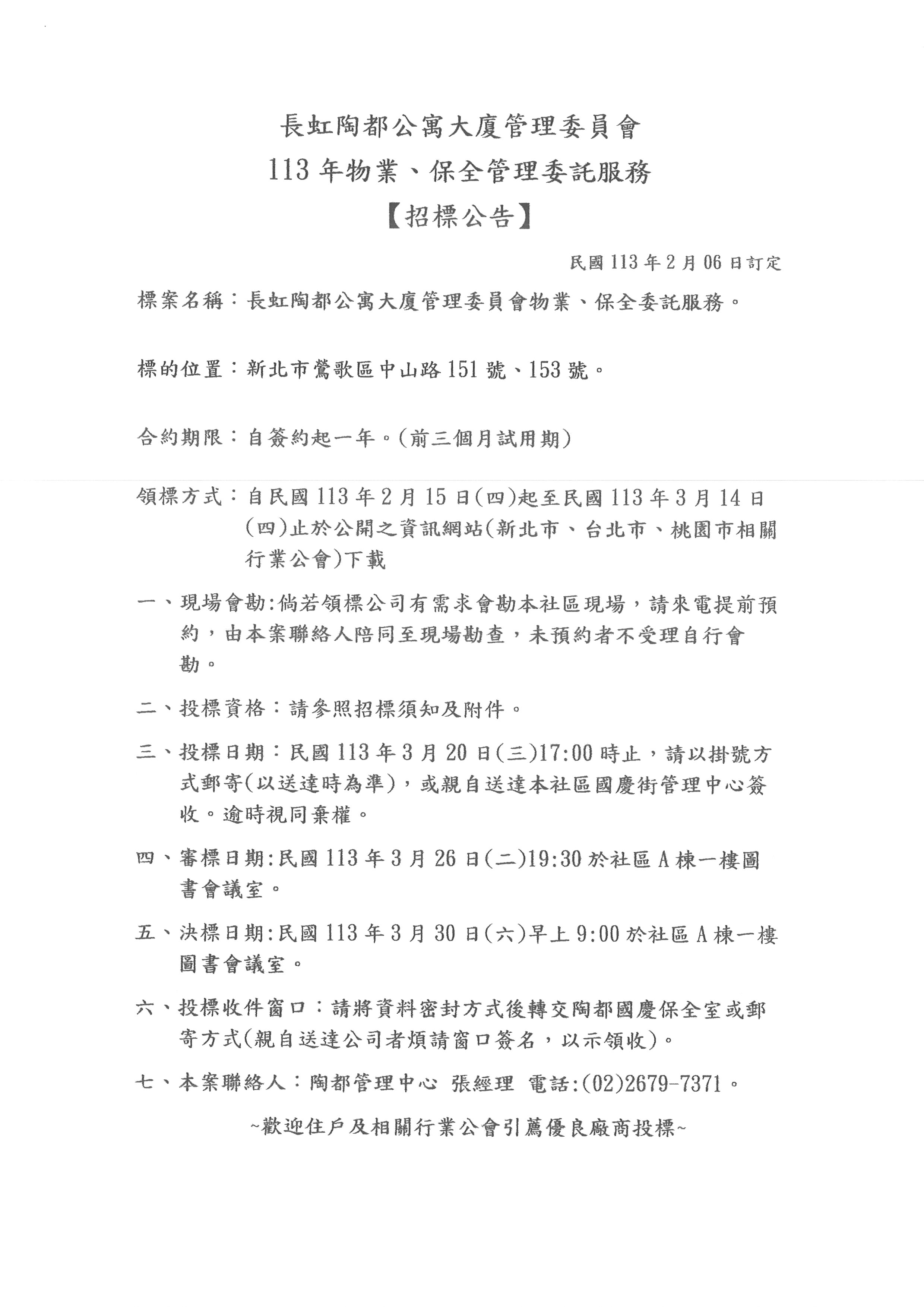 鶯歌區【長虹陶都】113年物業、保全招標公告(113.03.20 1700截標)