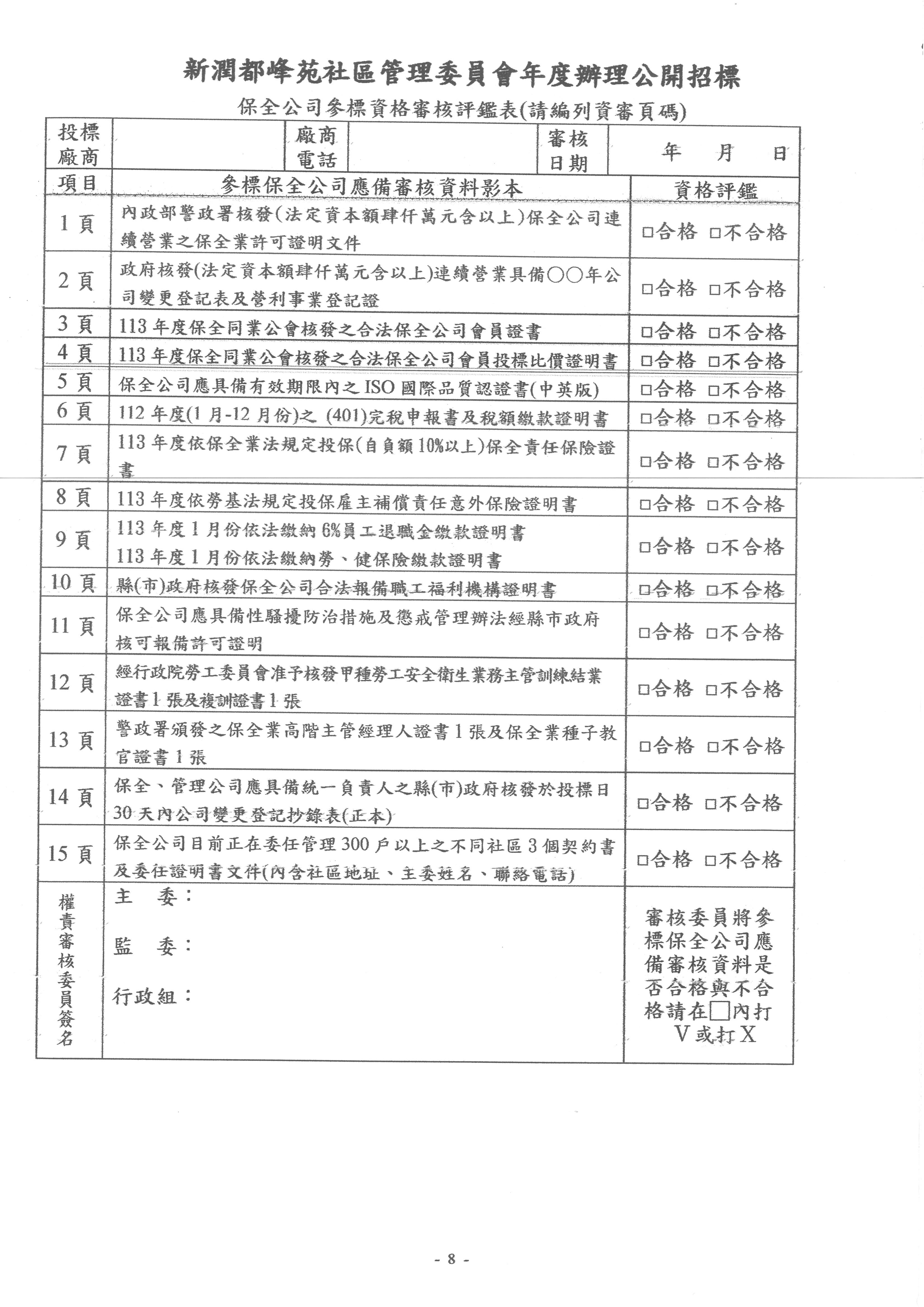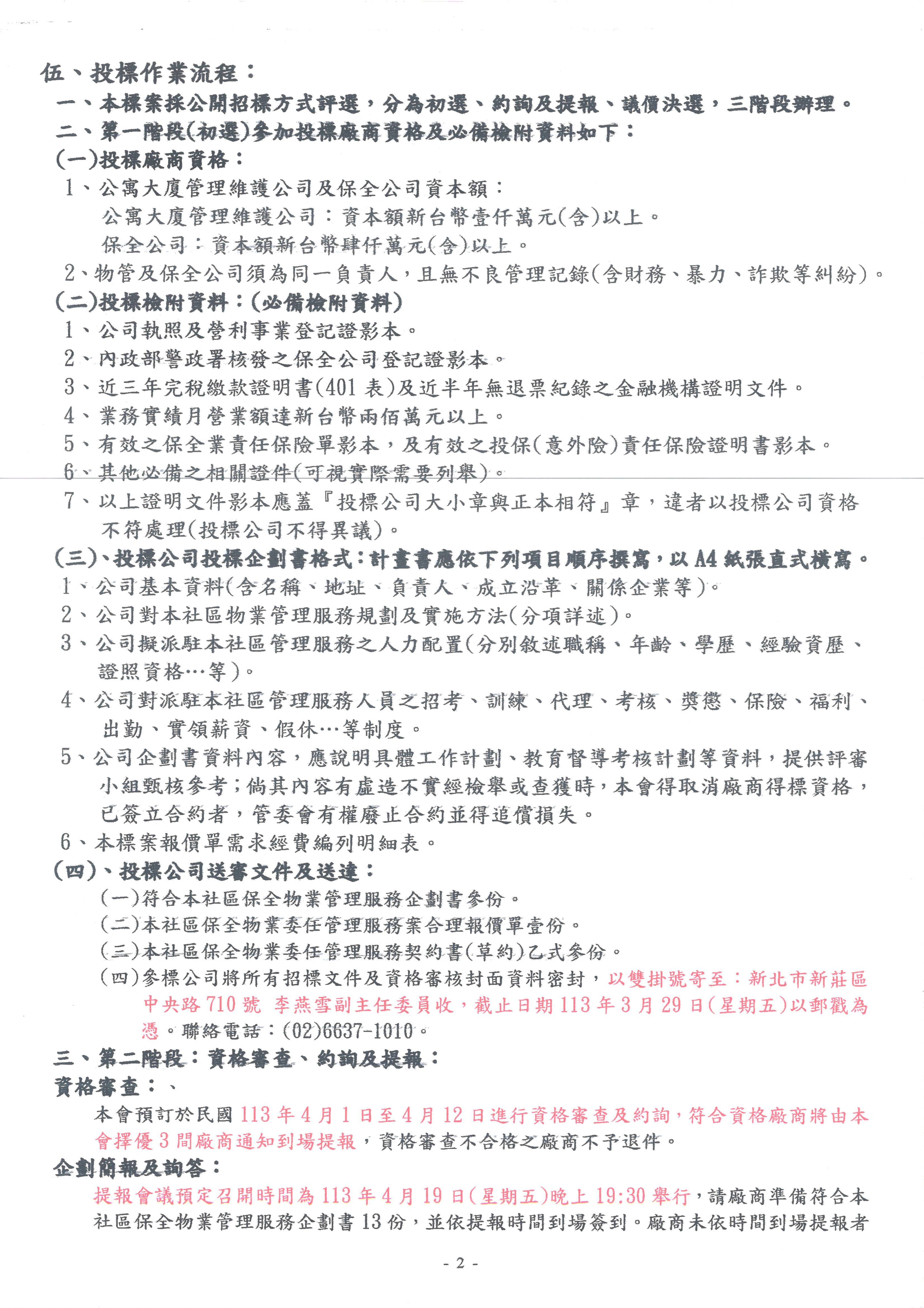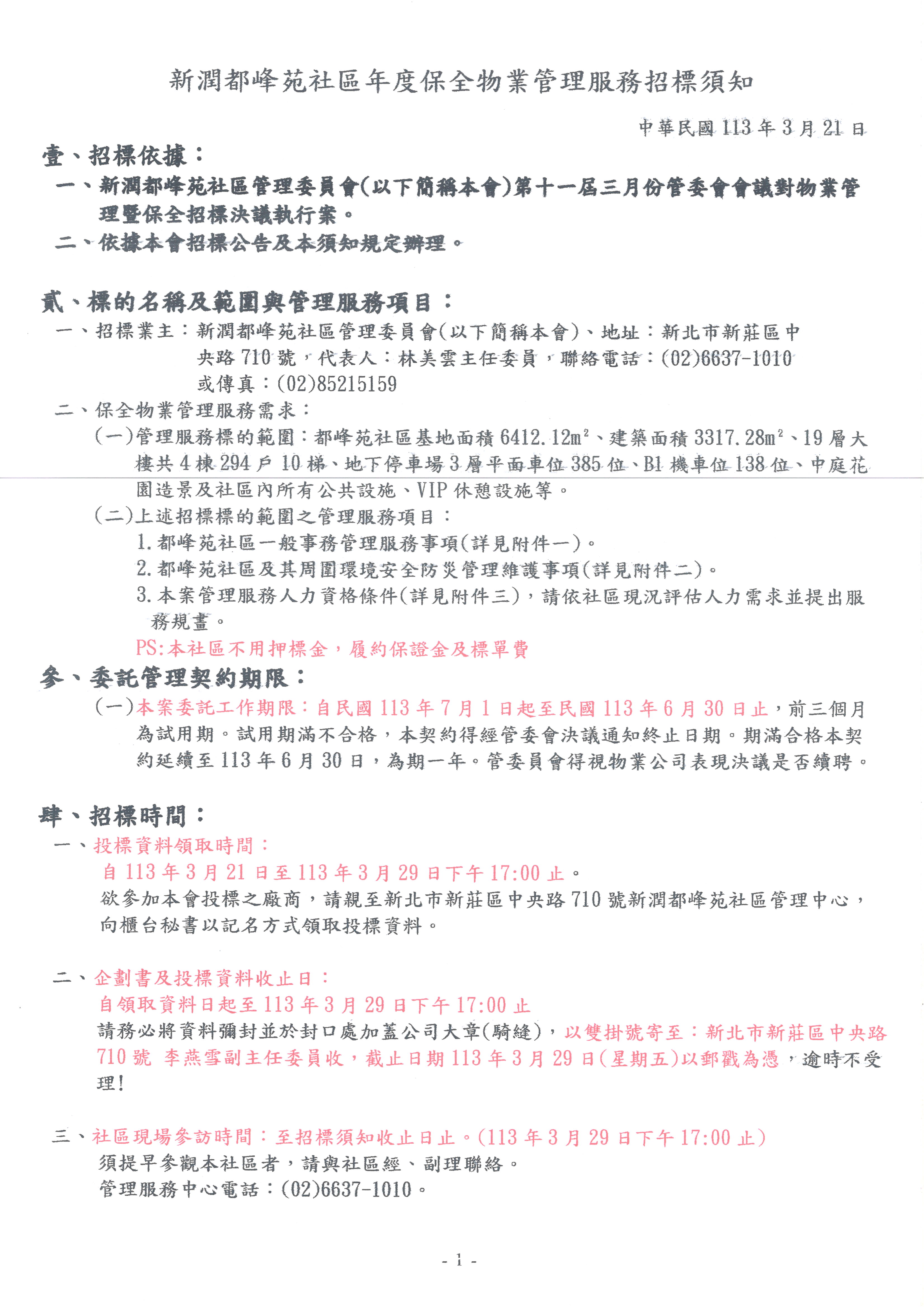 新莊區【新潤都峰苑社區】年度保全物業管理服務招標須知(113.03.29 1700截標)