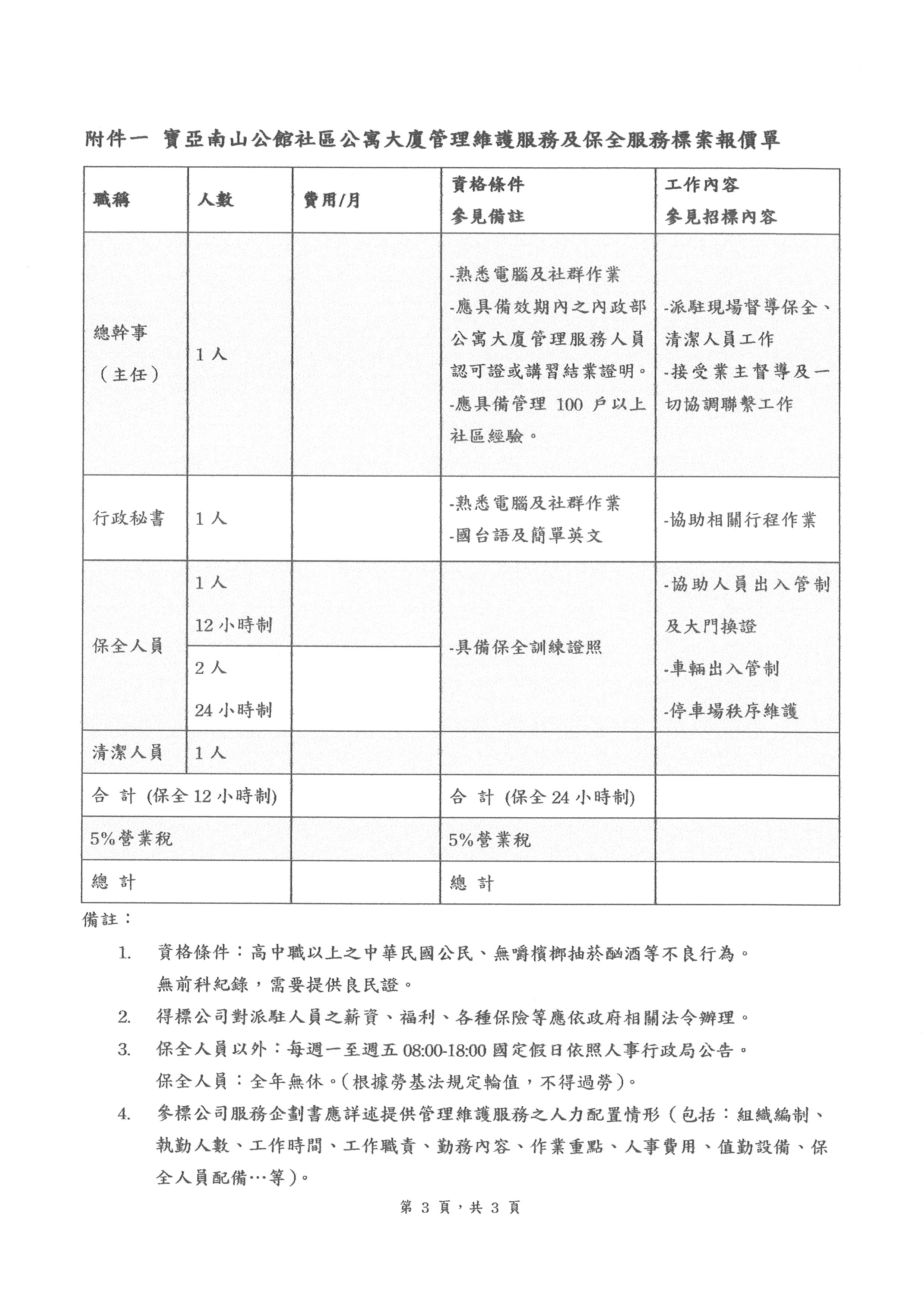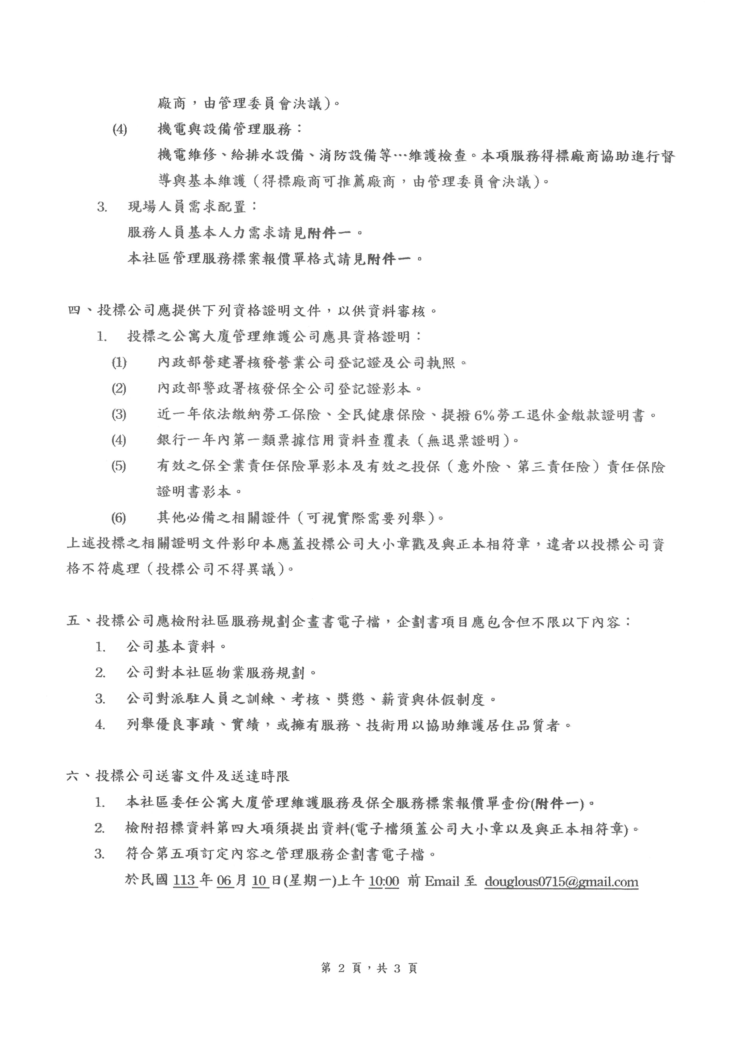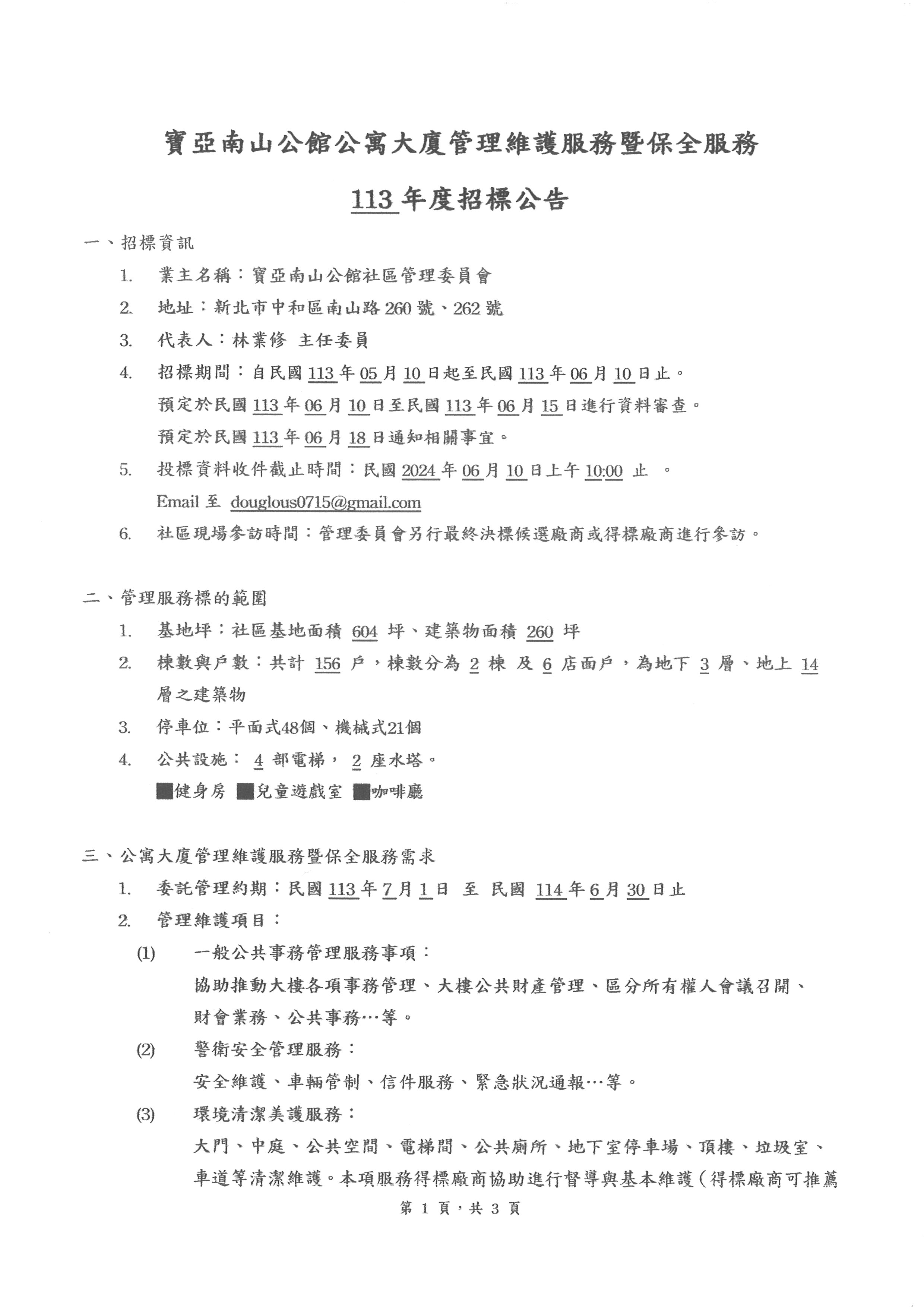 中和區【寶亞南山公館113年度管理維護暨保全服務招標公告】(113.06.10上午1000截標)